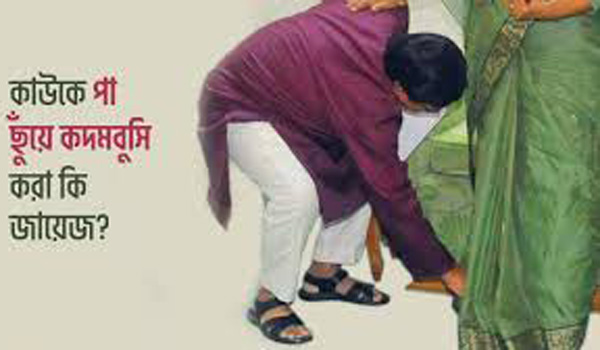 পা ছুঁয়ে সালাম করা, কদমবুসি করা বা পায়ে চুমু খাওয়া, পদধূলি নেওয়া– এ সবগুলো হচ্ছে মুশরিক জাতি হিন্দুদের অনুকরণে নিকৃষ্ট বিদআ’ত। মূলত কবর মাযার পূজারী আর ভন্ড পীর পূজারীরা মুসলমানদের মাঝে এই কুপ্রথা ঢুকিয়েছে।