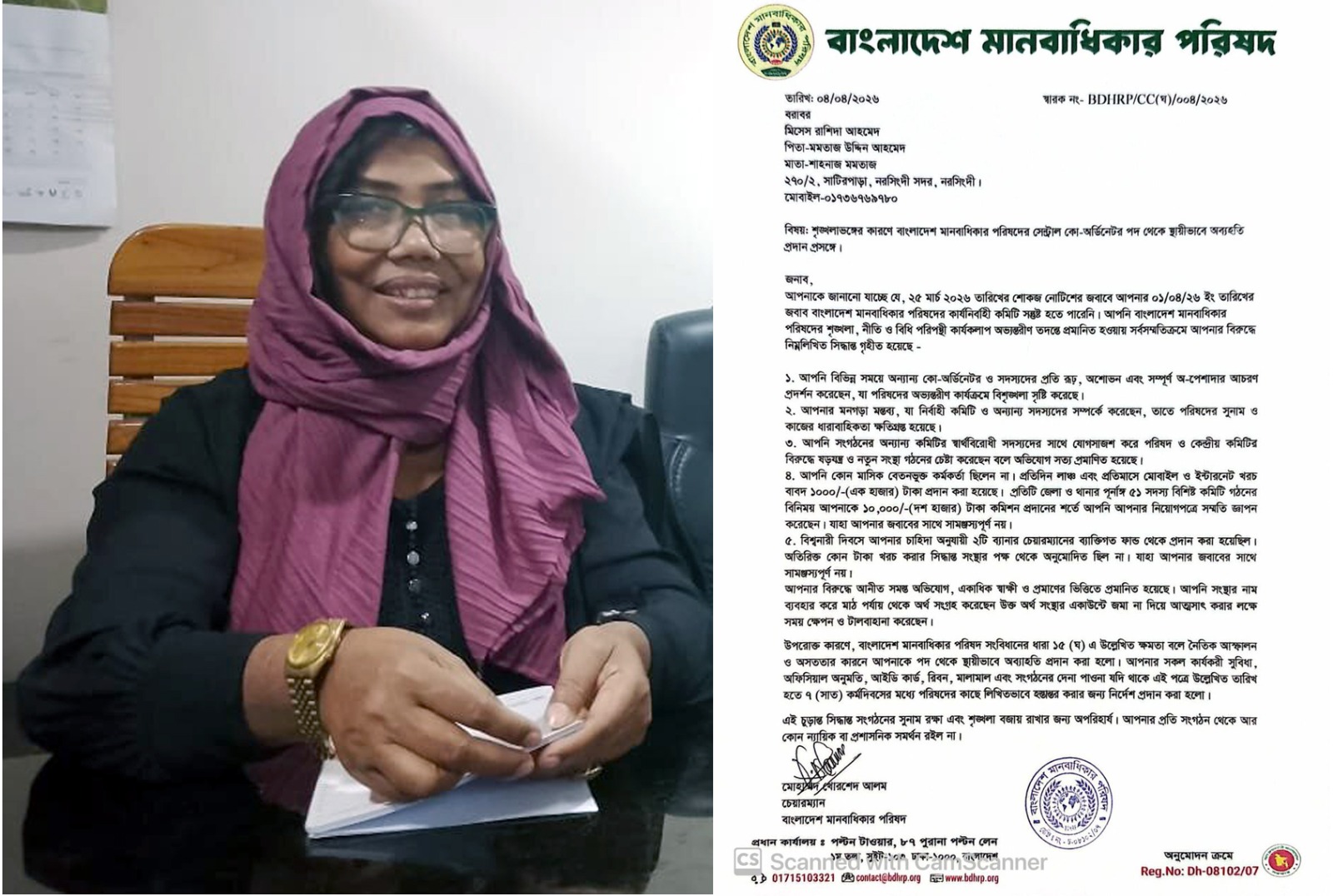 সংগঠন বিরোধী কর্মকাণ্ডে জড়িত থাকায় বাংলাদেশ মানবাধিকার পরিষদের সেন্ট্রাল কো-অর্ডিনেট  মিসেস রাশিদা আহমেদ বহিষ্কার
